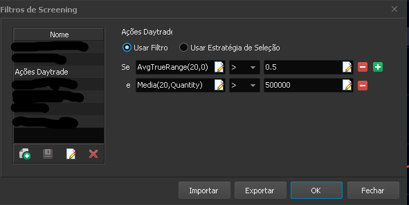 Na imagem abaixo, temos o exemplo de um filtro (screening) de papéis configurado na plataforma Profit Pro, da Nelogica.