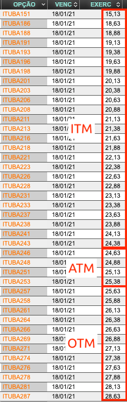 Já o número no final é uma indicação aproximada do preço de strike, como em ITUBA251 que tem o strike em R$ 25,13.