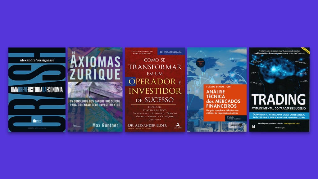 Lista com 5 livros sobre assuntos relevantes pra formação de traders. Economia, análise técnica, psicologia do trading, como lidar com risco etc.